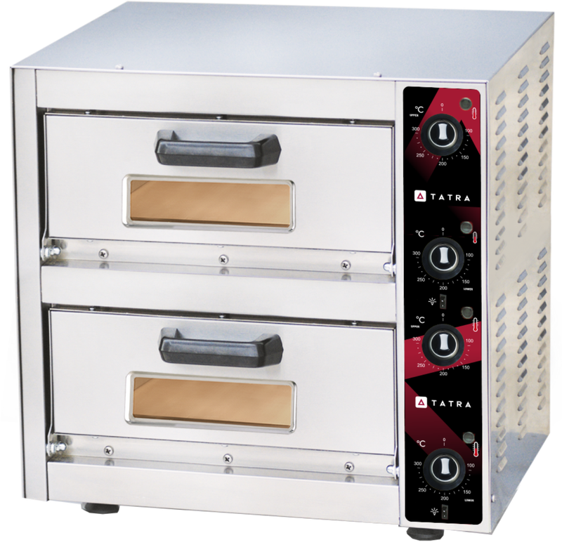 2 пиццы диаметром 400мм, размер камеры 400х400х100 мм*2, камера целиком из камня, 3 раздельных термостата 85 до 455 °С.